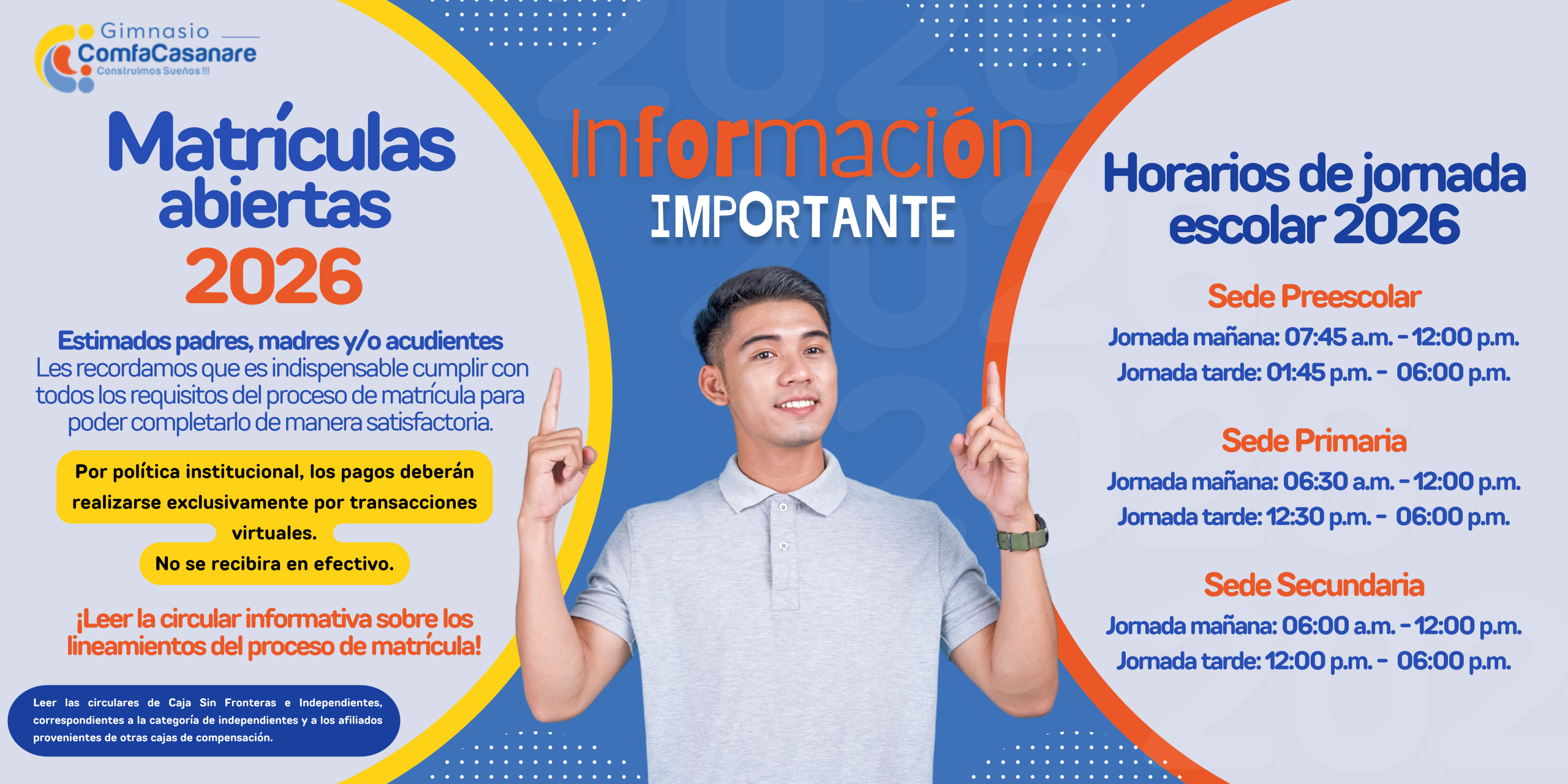 Por política institucional, los pagos realizados en el proceso de matriculas del Gimnasio ComfaCasanare deberán realizarse exclusivamente por transacciones virtuales, pagos en linea, pagos con tarjetas.